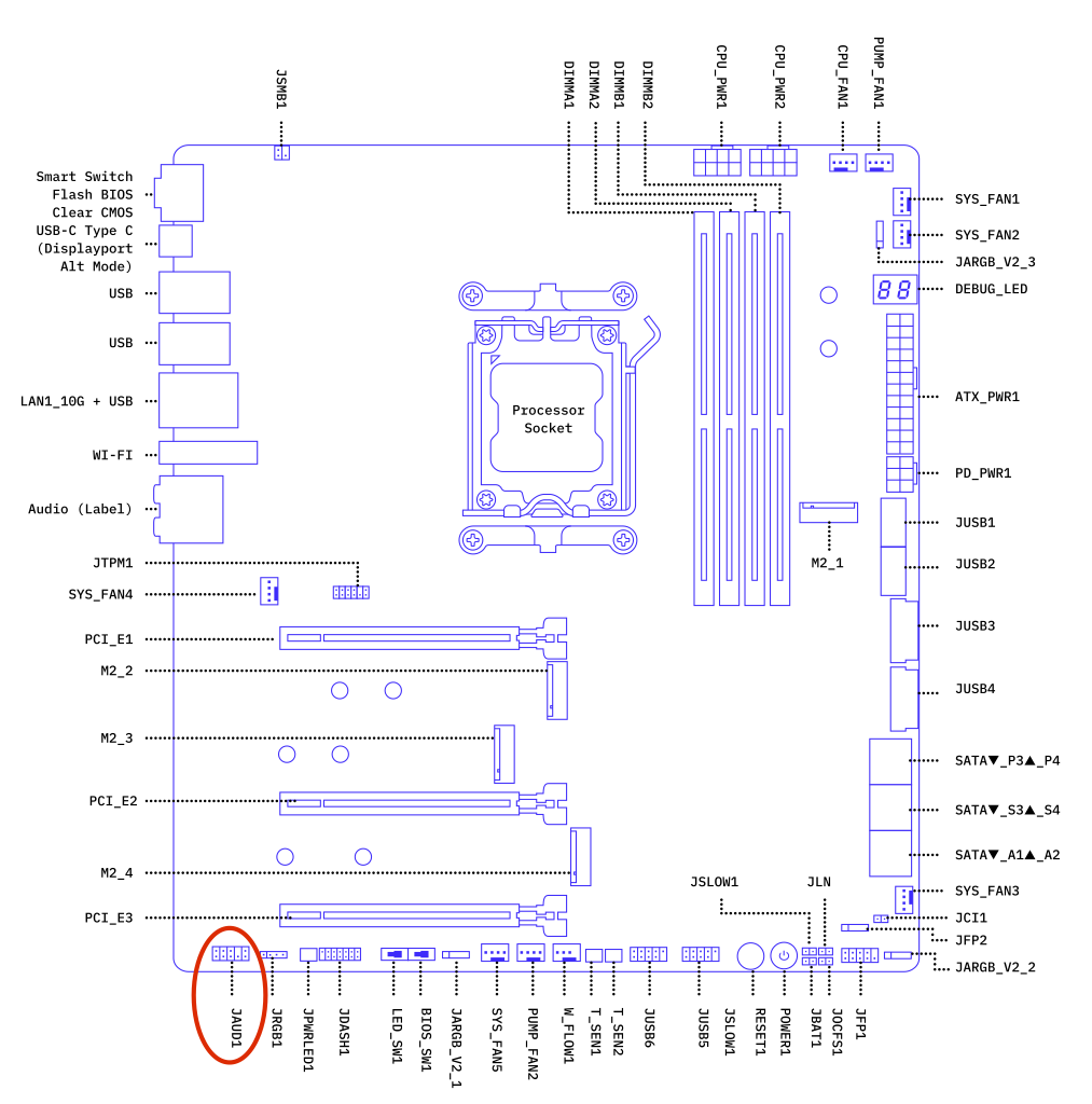 Refer to the image below for the location of the HD audio cable port on your motherboard, labelled JAUD1: